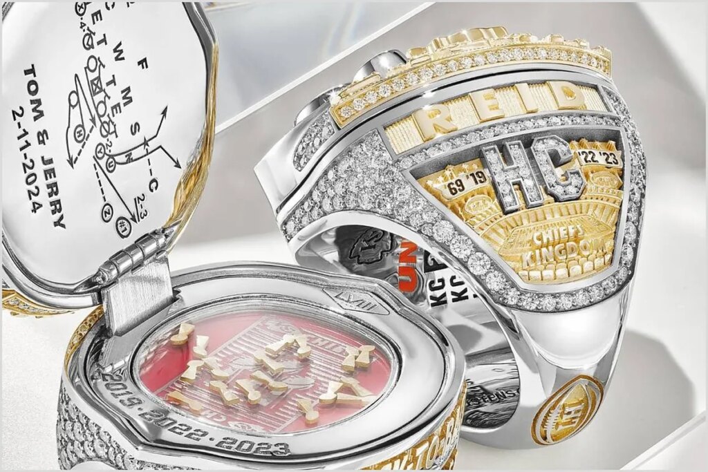 The favorite manufacturer of these pieces is the custom ring house Jostens, which is behind 38 of the 58 Super Bowl rings to date, including the first in 1967 and last year’s for the Kansas City Chiefs. Other pieces have also been designed by renowned houses Balfour and Tiffany & Co.