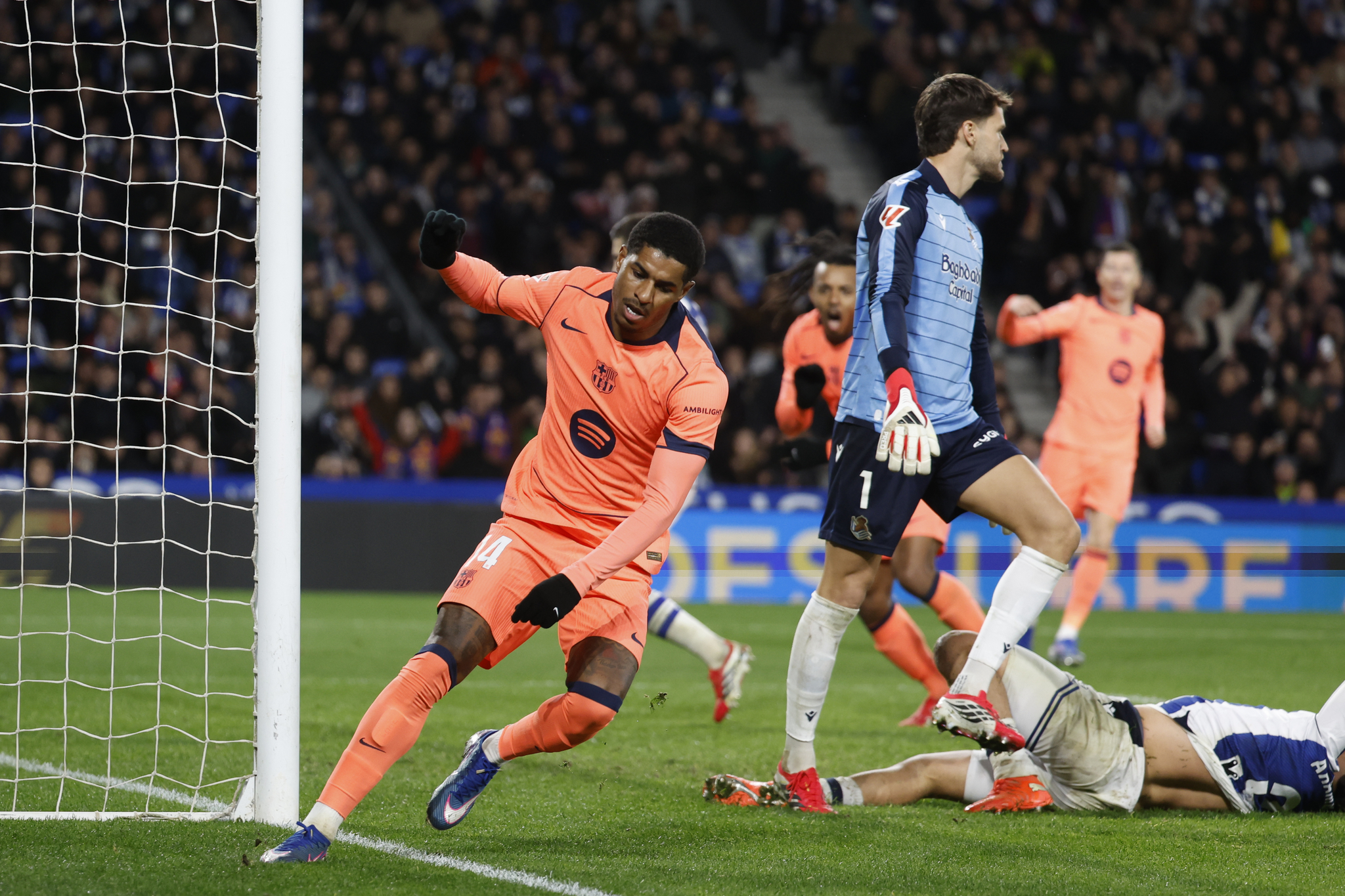 Goal! Real Sociedad 1, Barcelona 1. Marcus Rashford (Barcelona) header from very close range.